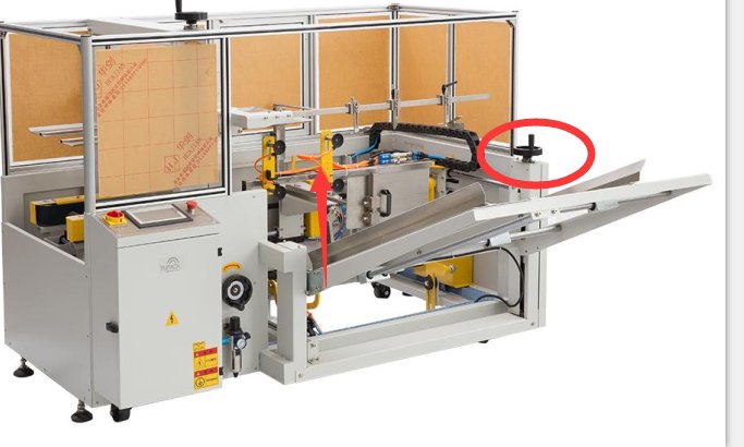 2、無法正常折箱。開箱機(jī)不能折底時(shí),機(jī)器會(huì)報(bào)兩種錯(cuò)誤,折前蓋超時(shí)或者折后蓋超時(shí),一般出現(xiàn)這樣的情況如果排除了紙箱太厚 太硬沒有折上去的情況下,多半是因?yàn)榱蟼}調(diào)節(jié)的不夠高,導(dǎo)致這前蓋和折后蓋的氣缸并沒有接觸到前蓋和后蓋,因此會(huì)報(bào)錯(cuò),用戶只需要調(diào)節(jié)這個(gè)手柄,將料倉的高度向上抬高一點(diǎn)即可。