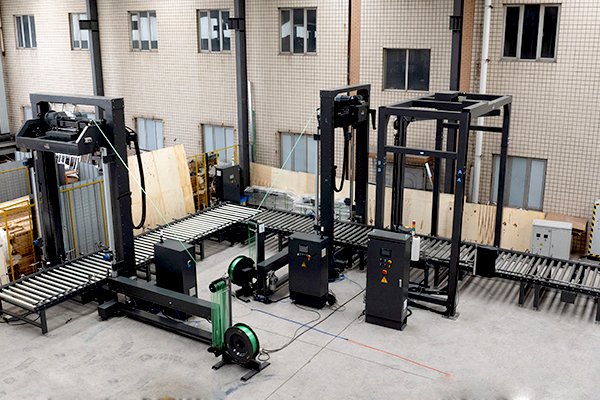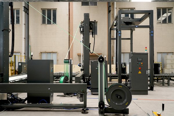 瓦楞紙板捆扎纏繞包裝線2臺頂壓式托盤穿劍捆扎機、1臺搖臂式纏繞包裝機以及若干滾筒輸送機組成。針對瓦楞紙板比較蓬松的特性,該線體配備了帶下壓功能的托盤捆扎機,最大壓力可達500kg,有效降低包裝體積,同時讓包裝物更加緊實,防止運輸過程中的散落。