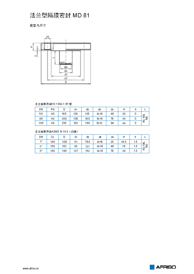 不銹鋼 316L 法蘭連接符合EN 1092-1 Form B1 DN 50至100或 ASME B 16.5(凸面)DN 1" 到 3" 法蘭頭部長50, 100, 150 mm |
