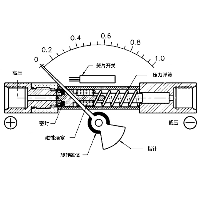 壓力作用在被電磁活塞隔開的兩個壓力腔內(nèi)。如果兩壓力腔的壓力有差異,電磁活塞就會頂著彈簧產(chǎn)生位移,電磁線圈將這個位移通過裝在指針座上的電磁線圈傳遞給指針。壓差直接由指針指示。壓力腔和顯示盤完全的機(jī)械隔離,排除了泄漏的可能。 |