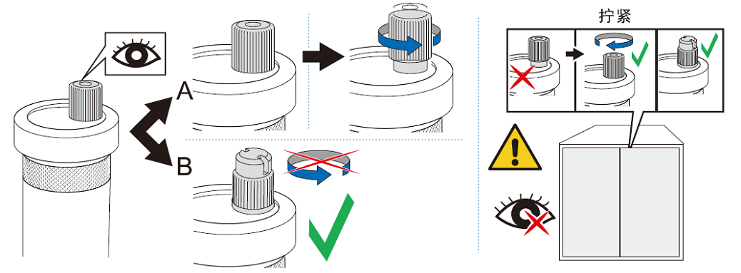 B) 防滴漏排氣閥自動排氣:旋帽保持?jǐn)Q緊,嚴(yán)禁旋松。