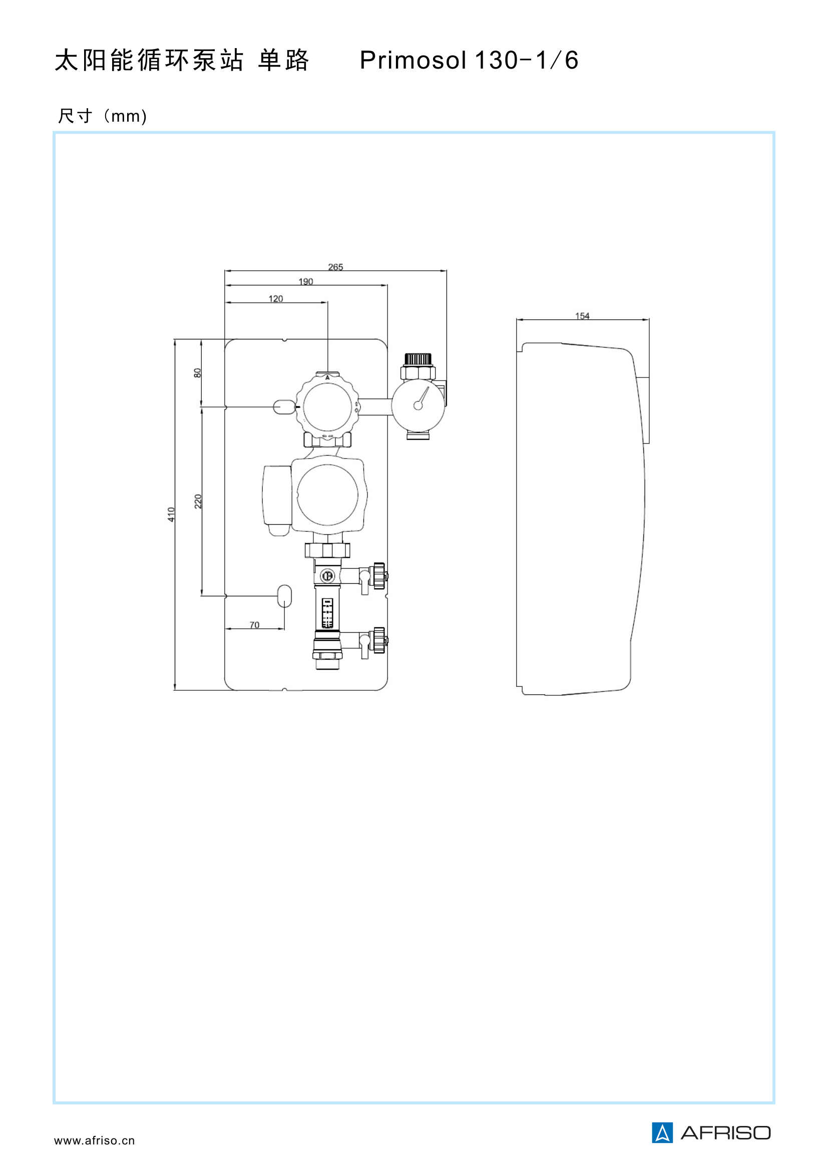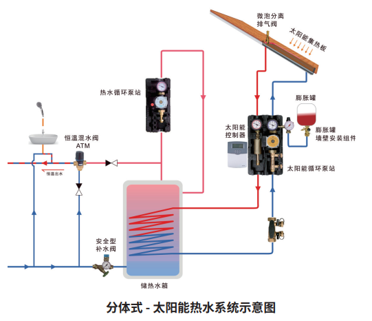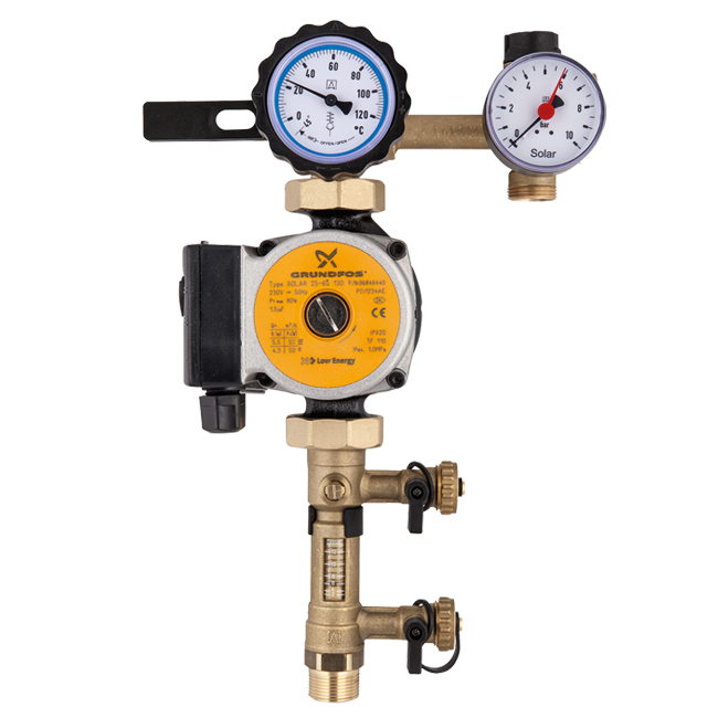 太陽能循環(huán)泵站應(yīng)用于分體承壓閉合循環(huán)的太陽能熱水系統(tǒng),安裝于太陽能集熱器與儲(chǔ)熱水箱之間的供水和回水管路上。 太陽能循環(huán)泵站的作用是根據(jù)控制器的指令來控制熱交換介質(zhì)(水和乙二醇混合液)在閉合管路系統(tǒng)中循環(huán)流動(dòng)。 |